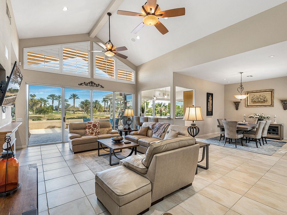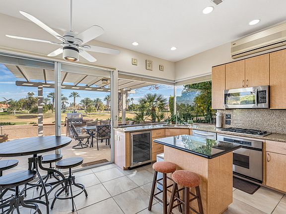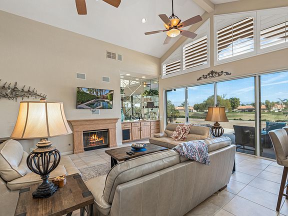 Tastefully enhanced Mission Hills stunner. Enjoy spectacular fairway and mountain views with this updated popular freestanding Evergreen Floorplan. Enter through a gated courtyard with ultra-private pool/spa with multiple lounge area highlighting the Mt. San Jacinto. Be welcomed to the to an expanding, open great room with vaulted ceilings framed with wall of glass, fireplace and built-in bar area. The separate dining area is great for entertaining and has piercing, western views. Entertainers kitchen with updated cabinets, granite countertops, island with counter seating, custom wine fridge, Décor range and exceptional views. Two Master Suites with baths, all tastefully updated, walk-in closets and sliders. One with fairway and mountain Views and one opening to the courtyard/pool view. Additional guest room with ensuite bath and a den/office/ optional fourth bedroom. Expansive terrace on golf course with built-in BBQ, surround sound, awning and great outdoor living overlooking views. For energy savers and additional security there are electric outside roller shutters. Recently updated pool heater and with nest thermostat installed for the interior. Do not disturb renters, please.