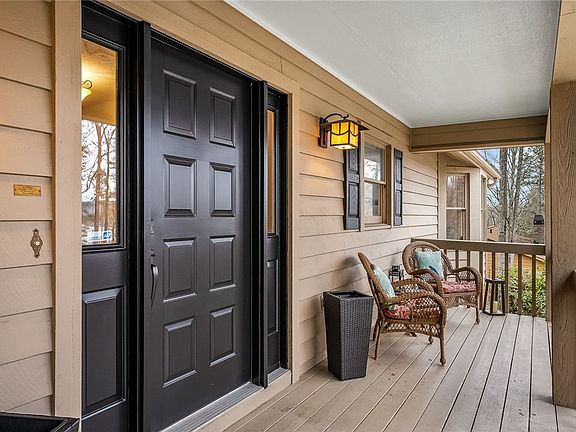 Garage and Outdoor Features - A covered breezeway from the front porch deck leads to the oversized two-car garage, offering ample space for vehicles, lake toys, and tools. Two driveways provide ample parking. Notably, the property is home to a historic Cherokee Trail Tree, located at the back of the lot behind the garage.