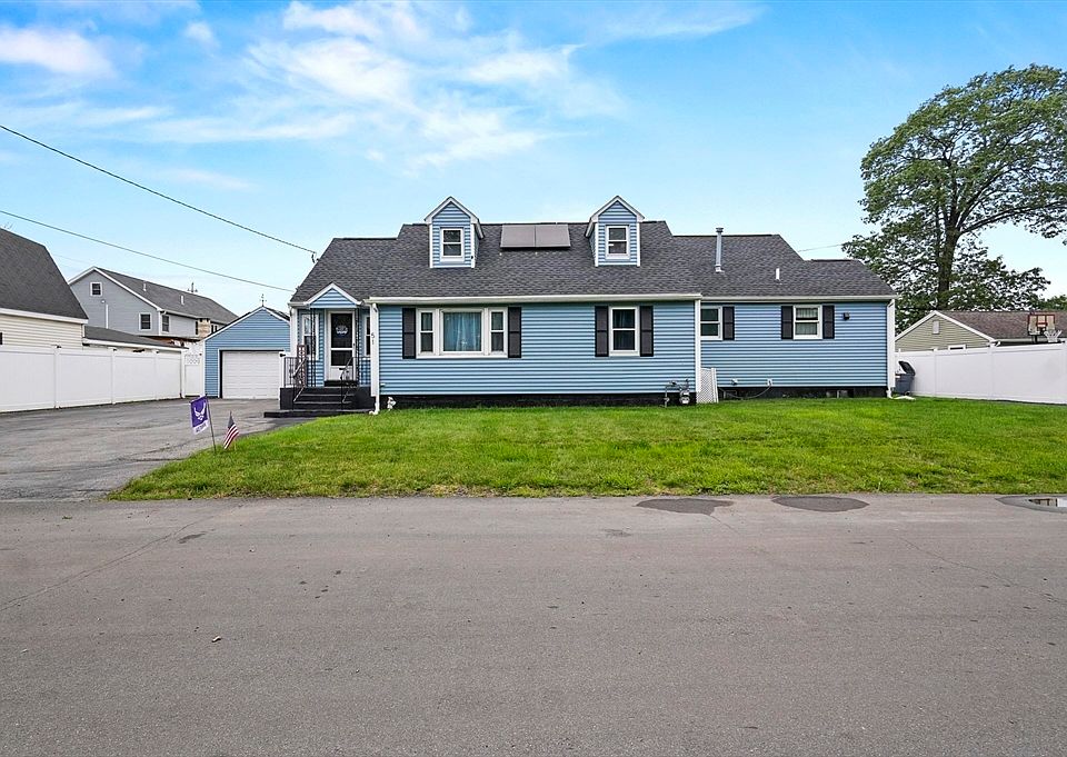 Tucked at the end of a cul-de-sac in South Lowell with easy access to Rte495, this spacious 4-bed, 2.5-bath Cape offers comfort and convenience. Featuring energy-saving solar panels and an EV charging station, this home blends sustainability with style. Enter the foyer into a sun-filled living room where a picture window highlights gleaming HW floors flowing into the formal dining area. An addt'l dining space features a large island with breakfast bar, wet bar w/ wine cooler, and opens to the updated kitchen with SS appliances and farmhouse sink. Two bedrooms and two full baths complete the main level. Upstairs, the expansive primary suite spans the entire floor and boasts cedar closet space. The LL includes a 4th bedroom, two laundry areas, and a half bath—ideal for extended living or guest space. Outside, the fenced backyard is a private retreat with a large deck overlooking the above-ground pool, patio, custom basketball court, and storage shed. Ready to welcome you!