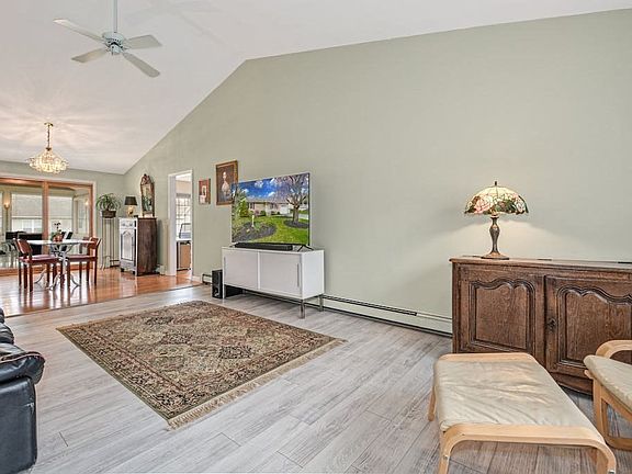 Welcome to sought after Birchwood Over 55 Community! Updated & well maintained detached ranch style home with 3 bedrooms & 2 full bathrooms. Bright, welcoming home with great natural light. Open concept living room & dining room w/cathedral ceilings & ceiling fan. Updated kitchen with new appliances, newly updated cabinets, granite counters & wood floor. Three season porch w/floor to ceiling windows, vaulted ceiling w/ceiling fan. Main bedroom newly painted and new flooring, along w/double closets & ceiling fan. Main bedroom has private updated bathroom w/tub & shower, tile floor, new lighting and new vanity. Two additional bedrooms both w/closets, one could be used as home office or den. Updated main bathroom w/shower, tile floor & built-in cabinet. Newly painted interior. Full basement w/workshop area, utility sink, built-in cabinets & additional double closets. Great area for an exercise room. One car garage. Vinyl siding. Central Air. Custom Shed. Great yard w/perennial gardens.