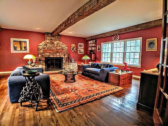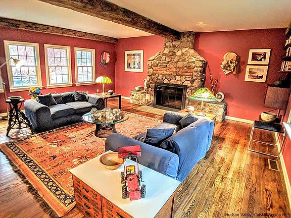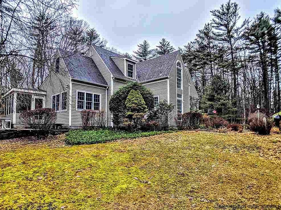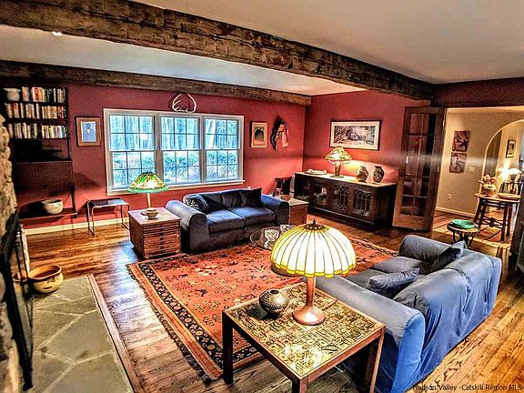 A long private drive leads to this warm and inviting Woodstock artists home on four landscaped acres. The gorgeous exterior takes your breath away as you approach, and the interior lives up to the highest expectations. An elegant, book lined entry foyer leads to the beamed greatroom with stone fireplace, perfect for cozy evenings. An arched doorway leads to a sitting area with stone walls and woodstove. The large open dining area is beyond, with windows all around. The gourmet kitchen has an unusual floor to ceiling window, wood cabinets, new stainless appliances, solid surface counters, pantry and a great breakfast bar. The laundry room and a half bath are conveniently located off the kitchen. This home is perfect for entertaining or just relaxing indoors or out, with a large screened porch off the dining room and a stone patio overlooking the gardens, stone paths and lawns. The ground floor master suite will appeal to all ages, especially the luxurious master bath with steam shower, walk in closets and complete privacy from the rest of the home. Three more bedrooms are upstairs and share a spacious bathroom. The third bedroom is currently used as an amazing studio by the current artist owner, with many built ins, vaulted ceilings and flooded with light on three sides. There's also a small den, and tons of clever built in storage. The owners have maintained and upgraded this home to the highest standards, including central air, alarm system, generator, new heating and electric. The three car garage has electric and a storage attic. Sale includes house on 2.31 acres and an additional 1.7 acre parcel. The location is ideal-down a long private road, yet just a few minutes to the center of town, the NYS Thruway and Kingston. This home is a rare find in Woodstock!