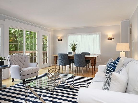 Located on a cul-de-sac in a quiet neighborhood with access to Jacobs Pond, this delightful home is warm and inviting. Updated baths, hardwood floors and fresh, neutral paint give the whole house a clean and bright feeling. Open family room/dining room has fireplace and French doors that open to deck overlooking the pond. Eat-in kitchen has center island with seating and sight lines to living spaces. Upstairs are three bedrooms with tons of natural light, all with hardwood floors and plenty of closet space. Enjoy newly refurbished neighborhood playground, basketball hoops, trails and picnic area at Jacobs Pond just down the street.