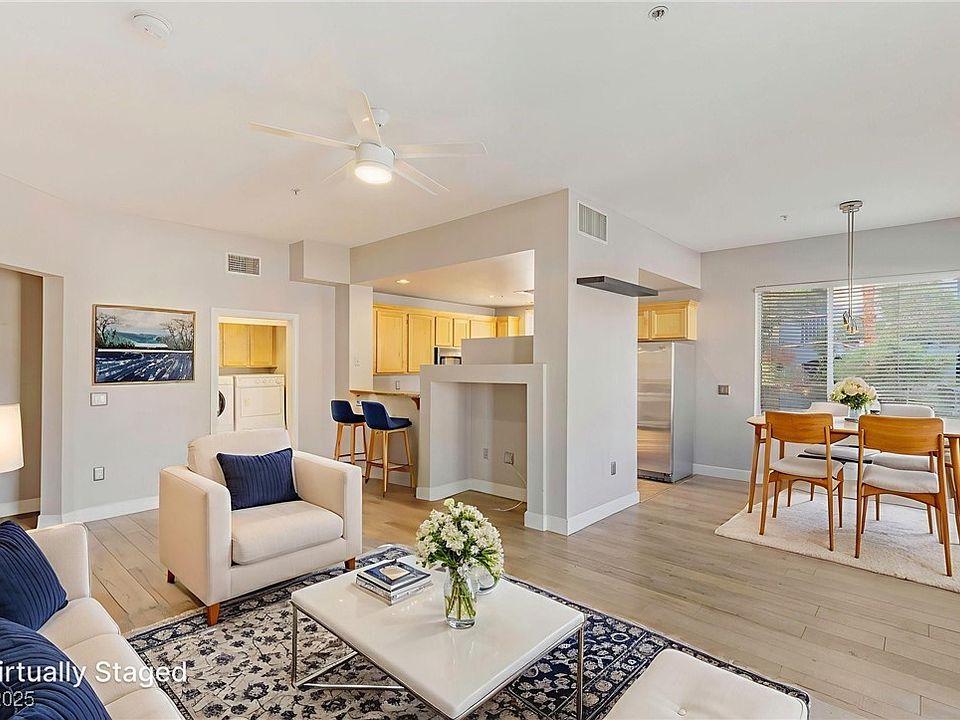 Stylish and beautifully maintained, this third-floor corner condo offers comfort, privacy, and resort-style living. Enjoy secure underground parking, elevator access, and a light-filled open layout with modern finishes, granite countertops, and a spacious private balcony overlooking the tennis courts and pool. The thoughtful floor plan lives like two primary suites—the secondary bedroom is set apart with a private door, full bath, and convenient laundry closet, making it ideal for guests or dual living. Residents enjoy premium amenities including a sparkling pool, fitness center, clubhouse, and more. Perfectly located just minutes from the Strip, dining, shopping, and freeway access. HOA includes water, trash & sewer.