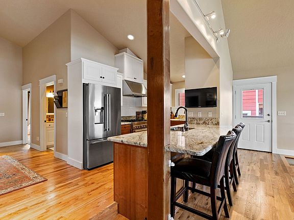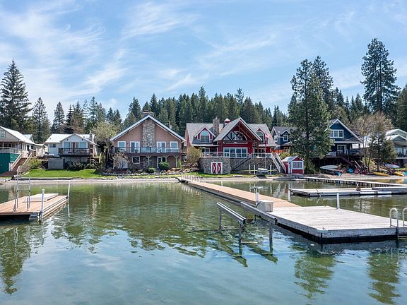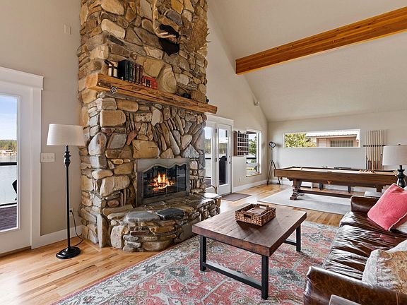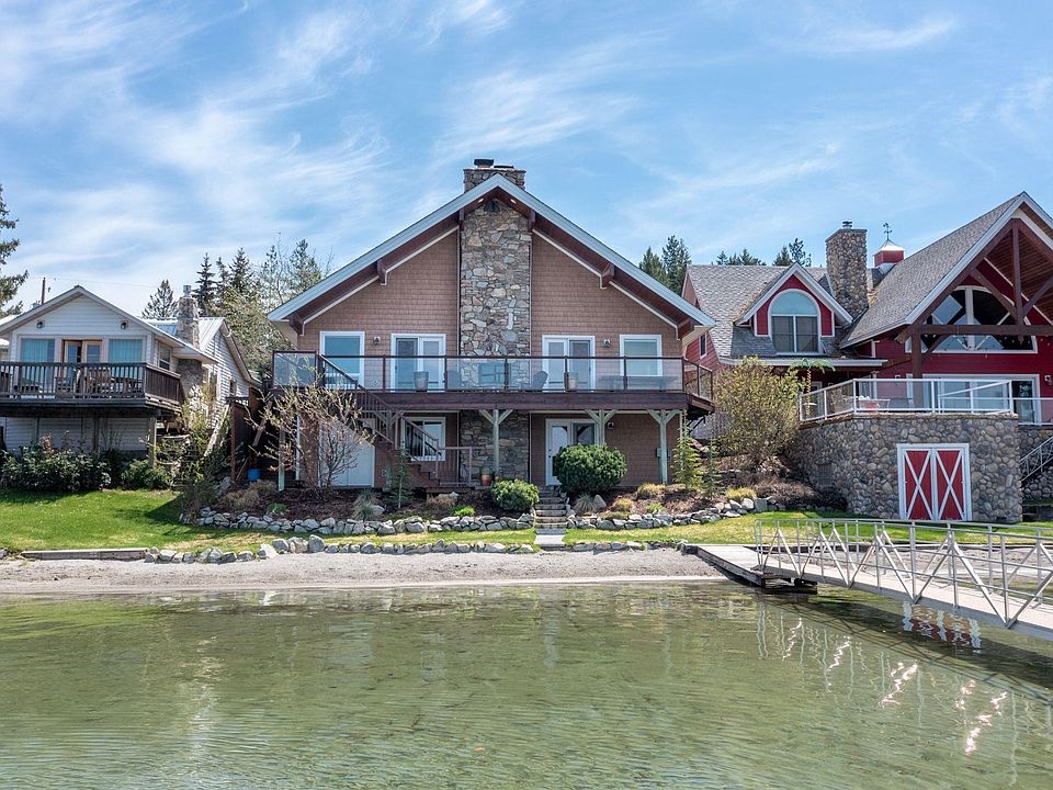Immaculate and "like new" 3008 sq. ft., 3 bed/ 3 bath, lakefront contemporary home. Placed on a level setting with 52' "no bank" frontage with grass to the sandy beach and water's edge. Built in 2005 and remodeled in 2021. Gourmet kitchen, upscale appliances, beautiful cabinetry, and granite countertops. The massive fireplace is built with colorful river rock from the Blackfoot River in Montana. Enjoy 180-degree panoramic views of Diamond Lake from the living, dining, and kitchen areas of the home. LL family room features a historic "white pine" bar and kitchenette, Brunswick granite pool table, sauna, and central vac. This stunning gem is located on Elu Beach - a highly coveted area, known for level lots, fine sand beaches, NW exposure, afternoon sun, and lovely sunset views. Lakefront has a gradual, gentle slope, ideal for swimming and water games. Boat dock new in 2013. Fence, sprinkler sys, det. 2 c. garage, carport. Property reflects attention to detail, care, and maintenance.