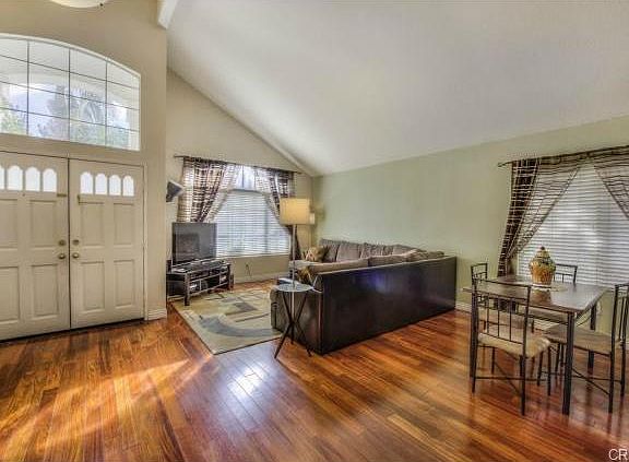 Nestled on a charming tree-lined cul-de-sac street,this home is the one you've been waiting for. Hurry on this one,don't miss this opportunity to live in the wonderful hillside community of Foothill Ranch. This lovely east-facing home has a bright & sunny orientation that you will appreciate. Once inside, you'll love the coziness of the living & dining areas with high ceilings,loads of windows,natural light & gorgeous cherry hardwood floors. Spacious 4 bedrooms, 3 full bathrooms w/approx. 1900 sqft of comfortable living space for everyone. Convenient downstairs bedroom is perfect for out-of-town guests. Completely remodeled & expanded kitchen is to die for. Rich, dark wood cabinets,walk-in pantry,slate flooring,stainless steel appliances,custom stove w/a stainless steel overhead vented hood,quartz counter tops,tons of counter space & under counter storage,large expanded center island w/ seating for five.Adjoining family room with travertine fireplace & custom wood mantle. Master suite boasts high ceilings,ceiling fan,remodeled bath w/custom tile shower enclosure,romantic Roman tub,dual vanity & walk-in closet. The backyard in highlighted by a covered patio w/stone flooring,tropical landscaping,stacked stone planters & a grassy area ideal for kids or pets.