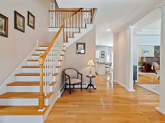 Here is your opportunity to get into one of Chester's most desirable neighborhoods, Premier Estates. This meticulously maintained colonial style home offers 4 bedrooms & 2.5 bathroom. As you enter this home, you will be surprised with the size & openness of the entry foyer. Greeted with gleaming hardwood floors throughout most of the first floor. The wide foot print of this home allows for a very nice sized eat-in kitchen with white cabinets, tile backsplash and pantry cabinets with pull-out drawers. The open floor plan into the large family room with gas fireplace and vaulted ceiling makes for a great entertaining space. The generously sized dining room features a double tray ceiling, chair rail & columns. Enjoy the formal living/sitting room with wood burning fireplace. The half bathroom off of the kitchen also features the laundry hook-up. As you make your way up to the second floor, the turning staircase adds a nice feel. Once upstairs, your will find the primary bedroom with full bathroom and walk-in closet. Three more nicely sized bedrooms and full bathroom complete the second floor. Enjoy the serene atmosphere while sitting out on your back deck enjoying your privacy and nature. The basement of this home is also meticulous. Although unfinished, it makes for a great space for storage or for future expansion of finished living space. Pride of ownership shows with this lawn & Landscaping. Pinkerton Academy School District. All of this could be yours. Showings start 4/2