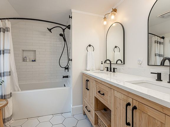 As you walk upstairs you'll find three bedrooms and a recently remodeled full bathroom with a large soaker tub, Signature Hardware double vanity featuring quartz countertops, and beautiful tile throughout. Black, white, and natural wood accents make this bathroom a spa-like retreat that you'll never want to leave.