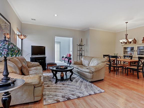 Welcome to the well maintained 2 bedroom 2 bath ranch in sought after Village Grande. Features include 9' ceilings throughout; bright eat-in kitchen with newer Samsung stainless steel appliances, custom cabinets, pantry and ceramic tile floor; living room/dining room with recessed lighting, hardwood floors and crown molding; large master bedroom with huge walk-in closet; master bath w/shower stall, double sink vanity; guest bedroomand main bathroom w/tub. A bonus sunroom with natural light w/sliding doors leading to patio w/awning. Recently painted in neutral decor. Newer washer and dryer. This adult community provides many amenities including clubhouse, swimming pool and tennis courts. Convenient to all major transportation, shopping and dining.