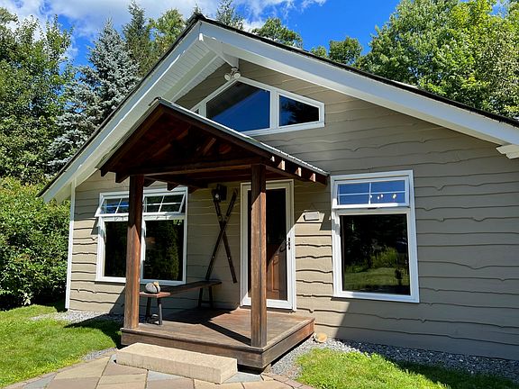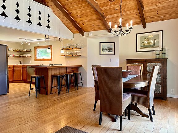 This three bedroom, two bathroom Stowe Hollow chalet exudes charm across its entire 1,800+ square feet. A light filled great room with 14 foot vaulted ceilings greets you upon entry. Here the living room, dining room and kitchen become one as the hub of family activity. The kitchen features all new stainless steel appliances, cherry cabinets and on trend shelving. A flagstone chimney and wood burning stove anchors the great room with oversized windows, abundant woodwork and exposed beams. A cozy den contains the necessities of modern life with its own shaded deck. Ascend the spiral stairs to a loft space currently dedicated to overflow guests. A mudroom with first floor laundry connects the chalet to an addition with two bedrooms downstairs and primary suite above. Outside a level yard presents ample opportunities for gardening, storage and hanging on the patio while enjoying the pleasing sounds of Gold Brook. From this location on the south side of Stowe one enjoys the flexibility to easily access the Village or avoid its congestion all together. Same goes for Stowe Mountain Resort which is equidistant via the Village or Moscow routes. Offered substantially furnished!