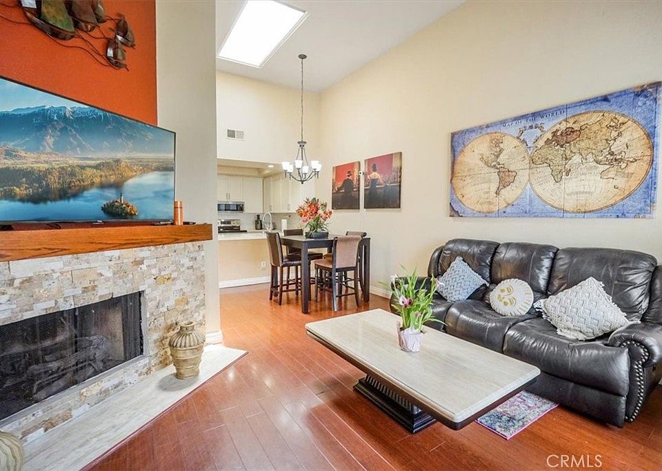 Welcome to your gem home in Laguna Niguel featuring HIGH VAULTED ceilings, open floor plan, updated kitchen with two bedrooms, and two full bathrooms. Quietly nestled in the back of the track, this end unit is up one flight of steps with no one above you. The entry welcomes all with a spacious living area, updated fireplace, eating area and updated kitchen. The kitchen features white cabinetry, quartz countertops, and a timeless subway tile backsplash. All this topped off with stainless-steel appliances, plus the included refrigerator. Added features include spacious bedrooms with high ceilings, added light fixtures in the closets, an in-unit washer and dryer, also included, and parking for two cars with one being an assigned coveted end spot carport with storage! You are close to one of the two swimming pools, but not so close that you hear them. Quick access to the back parking for friends and family. Mere steps away from the "Bluff Trail" for fun hikes and all the open space behind the track. Crystal Cay boasts amenities including a dog park, two pools and spas, greenbelts and walking paths, and trash collection is included with your HOA dues. The beach is a short drive away along with the Mission Viejo Mall for shopping and dining. Easy access to the 5 freeway and 73 Toll Road. Come see your new home today!