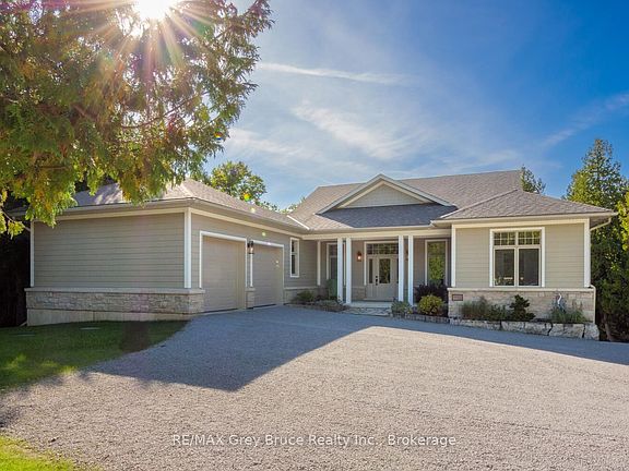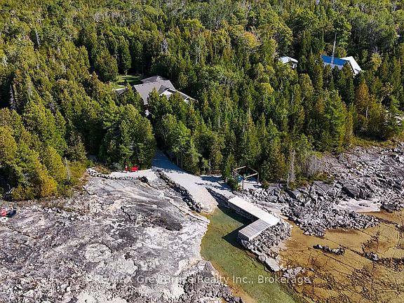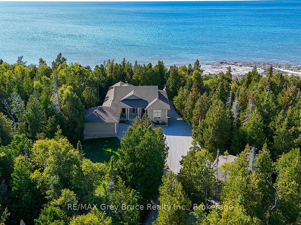 Breathtaking views, quality craftsmanship, and true pride of ownership! Set on a private 1.4-acre lot in a sought-after neighborhood, this well-maintained property features a gently curved driveway leading directly to the clean shoreline of Lake Huron. A dredged channel and L-shaped dock offer a protected harbour perfect for small boats, kayaks, or swimming. Relax under the timber framed pergola with Toja Grid sunshade and take in stunning sunsets by the water. The exterior boasts low-maintenance James Hardie siding and local Wiarton stone. With over 540 sq.ft. of decking - including durable, splinter-free Brazilian Ipe hardwood - there is plenty of space to entertain outdoors. Inside, a large foyer opens to an elegant living space with coffered ceilings, a stone fireplace, and Maple hardwood floors. The custom kitchen is characterized by the Titanium black granite countertops and Hubbardton Forge lighting fixtures. Form blends function with an induction cooktop, BI oven/microwave and plenty of storage. Step from the dining room onto a covered deck with a direct gas line for Barbeques or propane fire table. The main-floor primary suite offers water views, two walk-in closets, and a spa-like 5pc ensuite. A mud/laundry room connects to the attached garage for added convenience. The attached garage is fully finished with PVC lined walls. The walk-out lower level includes two spacious bedrooms, a 3pc bath, a large family room with in-floor heating, and a versatile workshop - ideal for hobbies or storage close to the lake. No shortage of storage space with the additional 24x24 detached garage added in 2020, plus a 8x12 storage shed. Additional features include central vacuum, central air conditioning, automatic whole home generator and water treatment system - all for comfort and peace of mind. 2885sq.ft., 3-bedroom, 2.5-bathroom home. First time on the market - this one-owner home invites you to enjoy peace, comfort, and natural beauty on the stunning Bruce Peninsula.