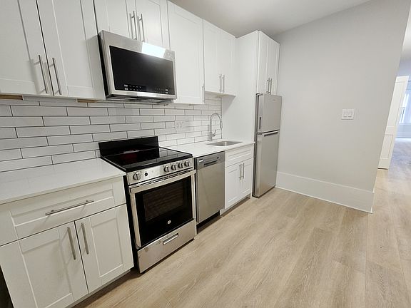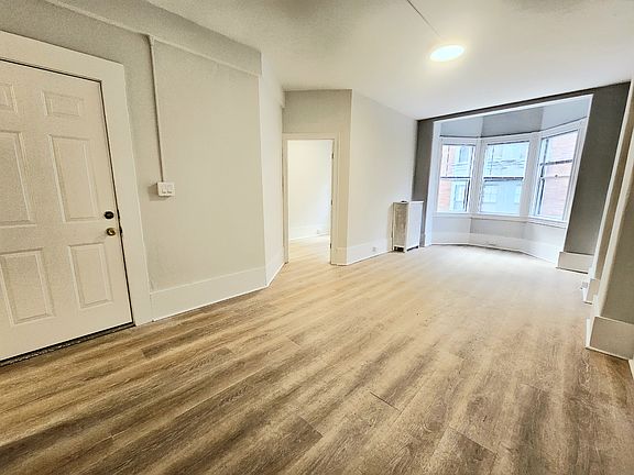 - Exterior features: BRAND SPARKLING NEW BATH, EQUAL SIZE BRS (on the smaller side, fits queen bed), FRONT-FACING BAY WINDOW, GRANITE/STAINLESS KITCHEN, HUGE LIVING ROOM, Heating included in rent, Heating system: Forced Air, Hot water included in rent, JUST FINISHED! GUT-RENOVATION!, PETS WELCOME, RECESSED LIGHTING