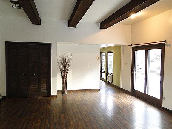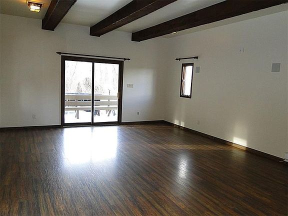This very unique Contemporary home sits on a beautiful piece of property! It offers a huge Living Room with beamed ceilings and wood laminate flooring. The Living Room has doors that lead out to a covered deck with built in bench seating which is great for having guests over for a visit. The Dining Room is open to the Kitchen. The Kitchen Island has room for barstools. Sit and relax there for a quick lunch. The Dining Room has a wall of windows that looks out to a large wooden patio and the beautiful backyard. Upstairs the full bath has a tiled floor, tiled shower wall and a pedestal sink. There is new carpeting in the upstairs bedrooms. The Master Bedroom has a dressing room that is 11x7. This room has a spiral staircase that leads to the outside patio. In the basement there is a full bath and an area that can be easily finished into a Game Room.