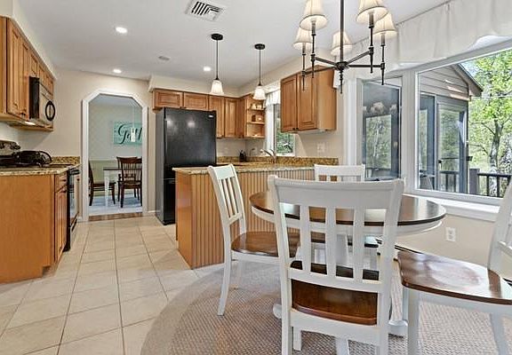 • Kit Dscrp: Countertops - Stone/Granite/Solid, Flooring - Stone/Ceramic Tile, Recessed Lighting, Remodeled, Window(s) - Bay/Bow/Box, Peninsula, Lighting - Pendant