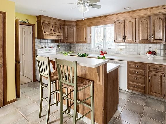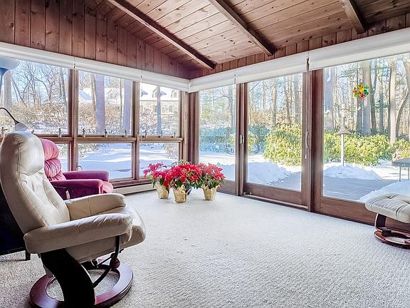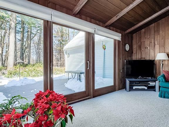 Absolutely charming 4 bedroom, 2 bath cape located in beautiful neighborhood setting. Main floor features fully applianced, cabinet-packed kitchen with Corian counters, tile backsplash, center island and tile flooring, gorgeous vaulted wood family room addition with stunning views of lovely landscaped yard and Koi pond, formal dining room with pegged hardwood floors, large formal living room with fireplace, built-ins and hardwoods floors under carpet, first floor bedroom and full bath! Second level features large master with double closets and built ins, two additional bedrooms and another full bath. Finished lower level family/game/play room and smaller room perfect for home office. Exterior features include deck, paved sport area, two car attached tandem garage loaded with storage and fantastic town center location within walking distance to library, pharmacy, ice cream stand, farmers market, town offices and more!