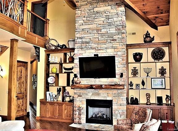 Stunning architecturally designed home priced to sell in beautiful SMCC w/18-hole mtn golf course community one hour SW of Asheville. Awesome views take your breath away as you enter thru the custom arched doorway. Quality features throughout w/soaring T&G ceilings, natural sunlight flowing thru gorgeous windows, stacked rock FP w/gas logs & built-in bookshelves on each side. Hardwood floors, 10-ft ceilings, parlor, casual dining & gourmet kitchen. Stainless appliances, wine cooler, under-counter microwave, double oven, honed granite countertops, Decora cabinetry & an island w/gas cooktop make cooking a pleasure. Main level living includes large luxury master BR/BA ensuite & huge walk-in closet, office w/built-ins, parlor, 1/2 bath & laundry room. Upstairs are 2 BR w/2 BA ensuites, walk-in closets, fitness room & theatre room w/a 100" screen, surround sound & cork floors. Outside - decks, screened porch, courtyard w/firepit & attached Carriage Style 3-bay garage. MTN LIVING AT ITS BEST