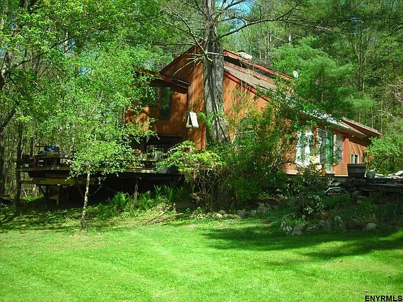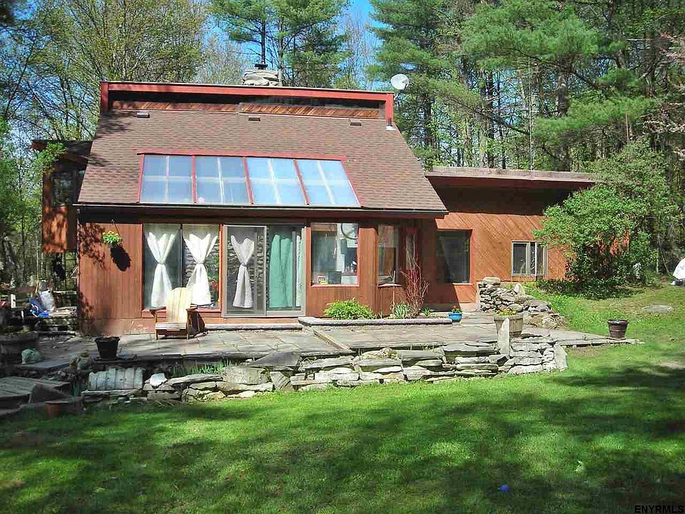 Beautiful custom "double envelope" home in a pristine and private setting on 3 acres. This stunning residence was designed by the original architect-owner to be energy efficient and in addition to great style, has passive solar, southern exposure sun room, and a magnificent stone central chimney. Warm wood floors and polished slate flagstones, multiple decks and skylights are most welcoming. Property includes a large separate custom in-law suite with deck above the 3-car garage. A unique opportunity!
