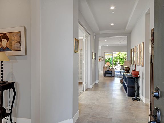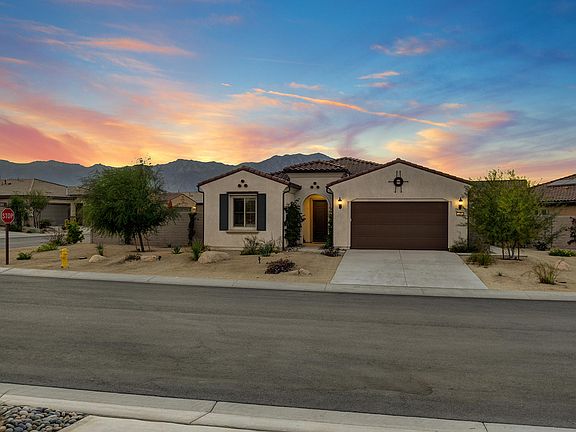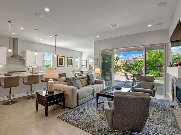 Lounge chairs view west across PRIVATE POOL, spillway of raised spa, flames at conversational fire-pit to a backdrop of the San Jacinto Mountains & Sunset! FIRST hand-picked premium corner 10,000+ sq.ft. lot from Phase One can be yours! Expanded popular Refuge Model. Open concept floor plan features large kitchen island, fireplace, and wall of glass looking out to totally private patio with raised planter, water feature and plenty of room for entertaining. The 3rd Bedroom can function as a den/media room with option to install French Doors directly to private pool lounging area. In addition you have a private office from center hallway. Many interior upgrades listed on attachment, including 12 owned solar panels, AV Surround Sound System, Cabinets, Flooring, Tile, Doors, Window Coverings, Appliances, complete hard/landscape and much much more! Ownership at newest 55+ Dell Webb Rancho Mirage Community includes 20,000 square foot recreation center, world-class fitness center, billiard, indoor golf simulator, resort-style pool with lap lanes, tennis, pickle ball and bocce ball. Hiking trails that stretch throughout the community. Move-in Ready! Low HOA!