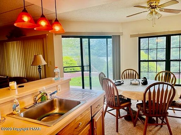 Lakefront living condo at Big Boulder Ski Slopes STR friendly live mountain lake lifestyle. First floor walkout 2 bedroom 2 bath 1 with whirlpool tub LR with woodburning fireplace dining area leads to your covered lake front patio galley kitchen breakfast bar meandering walkways along the beautiful Big Boulder non Moter boating lake to the lakeside pool with views of the peaceful water and Big Boulder Ski mountain enjoy year round living in your waterfront condo at the base of the ski mountain view the fall foliage from your living room picture window or patio sliders short-term rental friendly and option to join the mountain lake club with beach heated pool all season resort area good highway access restaurants water park golf casino and all Pocono attractions Hickory Run and mo