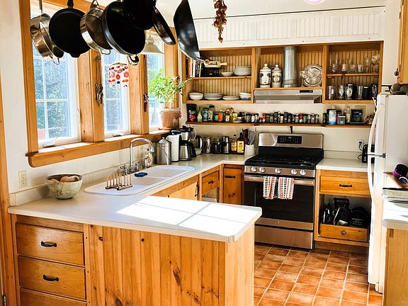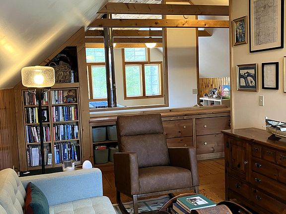 Clark Island hideaway with beamed architectural features and modern efficiency. Cape style dwelling includes warm wooden textures throughout and cozy Jotul wood stove. Open living, dining, kitchen area has southern sun exposure and access to the new wraparound Trex deck. The first floor also includes a bedroom, full bath, and laundry area. The second floor has striking vaulted ceilings with exposed wooden beams and includes a large bedroom area, office/studio (possible third bedroom), and a full bath with a clawfoot bathtub. The insulated garage building with loft and attached storage area has potential to be made into guest quarters or an accessory rental unit. Located at the end of a private road, the setting is quiet and wooded, with established gardens, apple trees, a fire ring, and unique rock formations. The Clark Island neighborhood offers a lifestyle of daily visits to the Clark Island Preserve for hiking, beachgoing, quarry swimming, xc skiing, waterfront dining, and access to the boat ramp at the Outward Bound campus. Tucked away in the woods of a private road association, but an easy drive to Midcoast Maine's picturesque villages, including Spruce Head, Tenants Harbor, Port Clyde, Rockland, Camden, Rockport, Thomaston, Belfast, and Damariscotta. Saint George public schools with ''School Choice'' for grade levels 9-12.