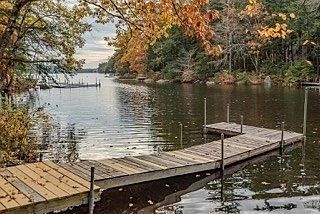 LONG POND ~ Nestled in a private cove with 100 feet of privately owned waterfront, this beautiful custom-built, year-round New England Cape exudes charm and elegance. The serene setting of this home coupled with wonderful landscaping and hardscaping offers tranquility and privacy. A gentle path leads to the waterfront, where you can enjoy peaceful moments by the water's edge and relax on the dock.Featuring one-level living, the main floor boasts a custom cherry kitchen that opens to the living room with cozy fireplace, dining room and office with a built-in desk and cabinetry. The primary suite located off the living room has a walk-in closet, radiant heat in the bathroom and tiled walk-in shower. Natural sunlight floods the home, highlighting the gleaming hardwood floors. With direct access from the living room, step out onto the expansive Timbertech deck with retractable awning, with beautiful views of the lake. Two additional bedrooms and a full bath upstairs, walk-out basement