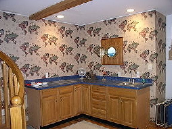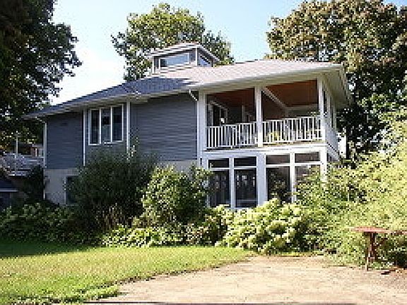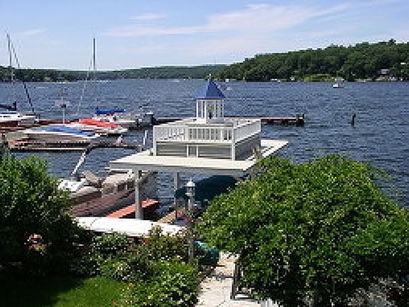 from 2nd floor covered deck Charming two story lakefront cottage with wide view of lake from 2nd floor covered deck.Screened porch on 1st floor.Railed parking for 3 cars with bridge for access to 2nd floor.Covered porch roadside.Kitchen, 1 bedroom, bath, living room on 2nd floor.Family room, utility (office) bedroom, bath, wet bar with fridge & freezer on 1st floor. Two full baths with showers.Wood burning stove..Cupola with opening windows and paddle fan.Cathedral ceiling.Storage shed.Some assorted tools included Covered 20' boat slip.Swimming dock.Canoe included,2002 Duffy 18ft Electric Boat included in sale.