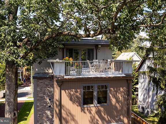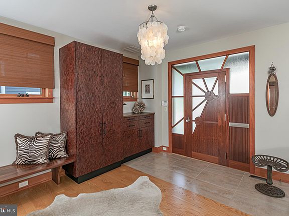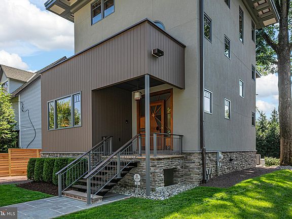 An extraordinary modern home guided by the principles of the Arts and Crafts movement showcases the beauty of natural materials and artisan-made details throughout a meticulously planned interior. Princeton Design Guild completed the project in 2011. Soon after, it was featured on the annual Princeton House Tour, an invitation for all to come appreciate the combination of exotic woods sourced from around the world, as well as lovely treetop views of the historic neighborhood edging Princeton University campus. The memorable details begin right at the front door decorated with celestial-themed inlays. Custom Loewen windows, handsome built-in storage and a stacked stone fireplace set the scene in the living room, which is unmarred by a TV, thanks to an ingenious hidden lift. The kitchen features distinctly grained rainforest marble atop Koa and Zebrawood cabinetry. A charcoal gray Viking range and separate warming drawer, instant hot and filtered water as well as an integrated Miele coffee station are some of the high-end appliances that have been serviced like clockwork. From the dining room, step through extra-tall glass doors to a terrace paved in rainbow sandstone perched above the newly fenced lawn edged with evergreen holly trees. You can also enjoy a view of the streetscape from a balcony off the main bedroom suite. A built-in workstation, a steam shower within the all-marble bath, Electrolux laundry appliances and a completely tricked out dressing room converted from the fourth bedroom make the entire second level a five-star owner’s retreat. The third floor is another destination unto itself with a sprawling rooftop terrace and a lounge area outside two more bedrooms. Down in the clean-as-a-whistle basement, you’ll find plentiful storage and a Savant Smart Home system that controls the climate, Lutron lighting, media and security throughout the whole home, as well as a Generac generator that ensures your comfort is never disrupted. Don’t miss the handy driveway side entry or the outdoor storage alcoves that keep firewood and garbage bins neatly tucked away - further proof that every inch of this in-town home was planned to perfection!