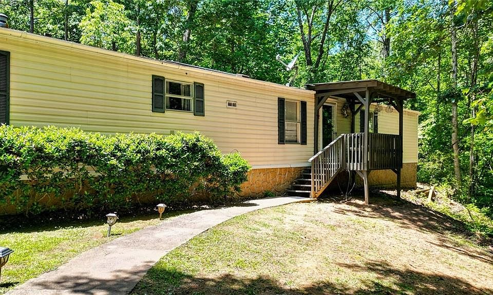Nestled within a serene wooded landscape, this charming 3-bedroom, 2-bathroom ranch home offers the perfect blend of tranquility and comfort. Step into a welcoming interior filled with abundant natural light filtering through the trees. The spacious living area provides an inviting space for relaxation or entertaining, and the split-bedroom floor plan allows for optimum privacy. The kitchen is the heart of the home and has all the modern appliances you need, plus plenty of storage space and is open to the living area. In addition to all these great amenities, this home is offered fully furnished with nearly new furniture throughout. Stepping outside, discover your personal oasis—a gleaming above-ground pool awaits, offering refreshing dips on hot summer days. Embrace the outdoors on the expansive deck, perfect for hosting gatherings with friends and family or enjoying peaceful moments in nature. The home is located on a large wooded lot just minutes from Lakepoint Sports Complex, Lake Allatoona, and all the dining and shopping experiences of downtown Cartersville and Acworth. (This home is a single wide mobile home with a retired title.) --
