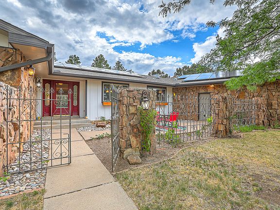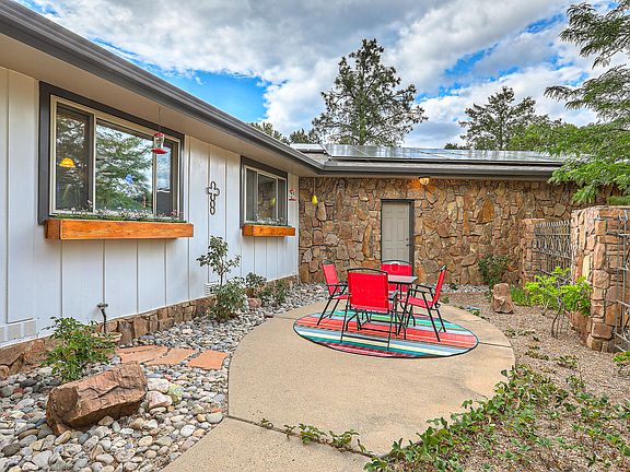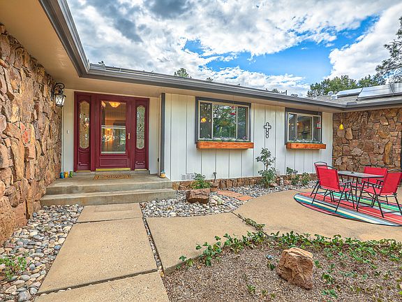 Extraordinary mountain home! Located in Ponderosa Ranch Estates this truly stunning home sits on approx. 3.3 wooded acres that also has plenty of flat space for horses or whatever your heart desires. Welcomed from the moment you enter with the spacious floorplan that includes: 2 living areas & a formal dining area with beautiful cherry wood floors; a remodeled chef's kitchen with gorgeous custom cherry wood cabinets, granite countertops, double ovens, wine fridge, kitchen island & a cozy breakfast nook; large primary suite with a full bath & 2 other nice sized bedrooms with a full bath in the hall. Great outdoor space with TREXX deck, a hot tub & pergola is a great place to relax! Added Bonuses: Owned Solar, a 2nd workshop/garage, Refrigerated Air & 2 gas stoves make this a true gem!