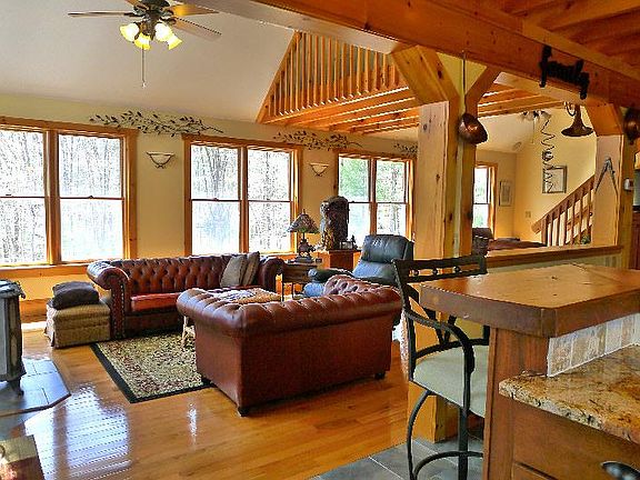 Make money on your utility bill? Builder's Own Green built home. Geo-Thermal powered heat &A C, active (owned) & passive solar systems that are so efficient the electric company PAYS HIM each month. A simple exterior... then enter a stunning combination of warm woods. soaring ceilings, &superior craftsmanship. OPEN FLOOR PLAN, large rooms appointed with carefully selected fine materials: granite counters,unusual granite farm sink, custom oak cabinets, island breakfast bar. Anderson windows throughout, 6-panel wood doors (1st&2nd Level) & MORE. Exposed joists give cozy cabin feel in contrast to dramatic,bright living room. Nature surrounds you, peeking in every window.17+ acres including a pond & a bluff - a nature lover's paradise. Free access to Delaware River (picnic, sun, kayak, swim) just down the road.