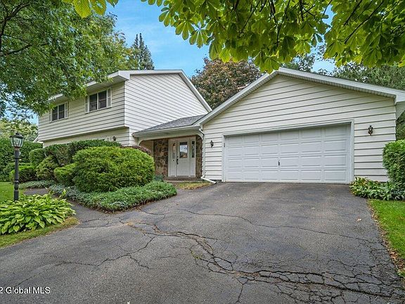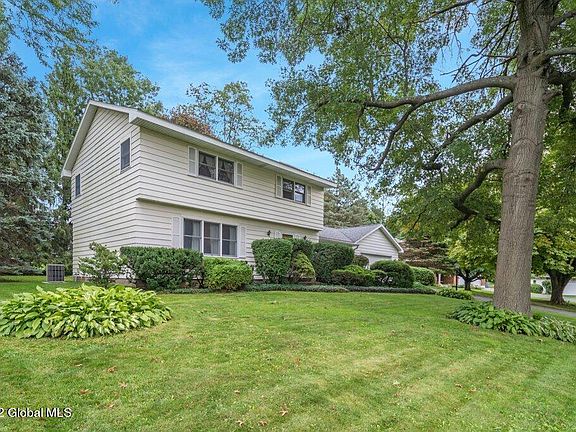 Located in Latham's highly sought after Riviera Estates sits this spacious side hall Colonial featuring 4 BR's and 1.5 baths. Full bath features Jacuzzi jetted tub. HW flrs throughout. Nice kitchen overlooks large family rm with vaulted ceilings, skylights, and gas FP w/ custom windows allow sunshine to stream in. Formal LR & DR. Awesome deck overlooks private wooded lot with IG pool and custom shed /pool house with sitting and changing area. Newer furnace, H20 tank, and roof. Full dry basement features plenty of room for storage. Walk to local shopping or Forts Ferry School. North Colonie schools and reasonable taxes.
