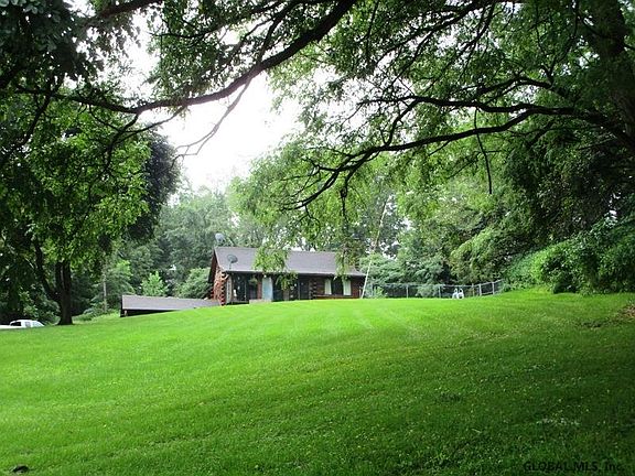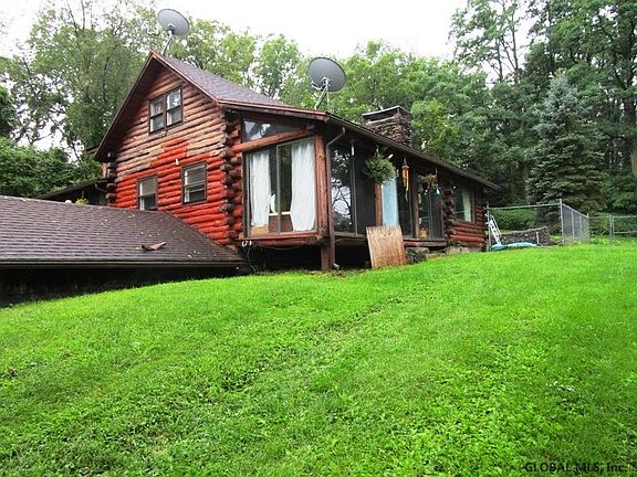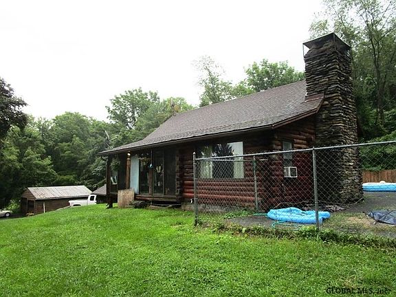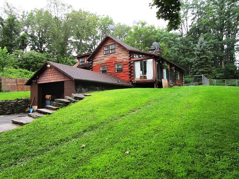 Well kept log home, sets nicely off road for privacy, park like setting, with a country feel, yet minutes to the center of town or thruway. The main floor is mostly open kitchen , living, dining areas,with a fireplace in the living room, cathedral ceiling, and a bedroom and bath. There are two bedrooms upstairs. There are two enclosed sun porches, a built in out door BBQ, and pool. The lower level is partially finished, with a fireplace, bar, laundry room, and bath. There is a separate detached 2 car garage, plus garage under the house. Some areas fenced, stone walls, pleasant views. A very comfortable home for living in, entertaining, even a possible summer get away. Come make it yours.
