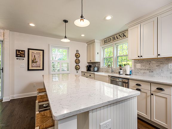 Tastefully renovated in 2015 this Cape offers 3 bedrooms, 2 full baths, 1 car garage & basement located on one of the most desirable streets in Red Bank. Beautiful white kitchen, Silestone counters, lg center island, marble back splash, GE SS appls, custom hood ,ice maker line, farm sink & pantry. Barn door in DR. Living room features gas fireplace & Anderson sliding door to privately fenced backyard with paver patio & walkways. Hardwood flrs, plantation shutters, & 5 1/4'' flr molding throughout. Professionally landscaped. Remodeled 2 full baths plus a soaking tub; replaced in 2015 roof; windows; all exterior doors, 2 zone heat & A/C, HWH, sewer line, water line, patio, walkways, fence & gas line for BBQ! The Perfect Home! Move in-ready! Short distance to downtown & transportation