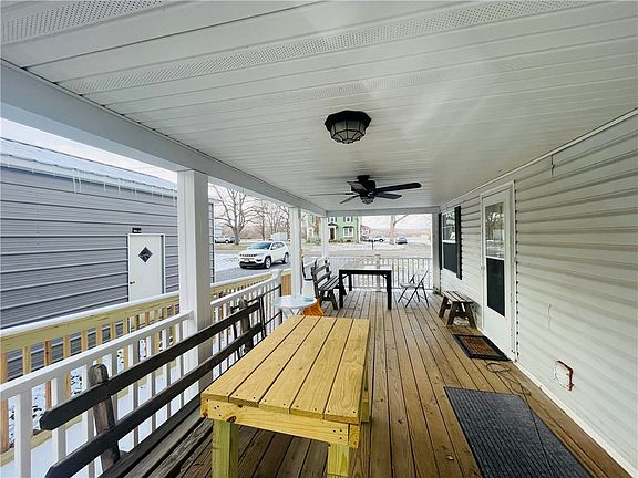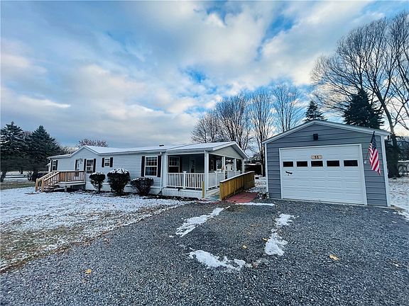 Charming single-story manufactured home located in the heart of the village of Nunda, set on a spacious nearly half-acre lot! This inviting property offers 3 bedrooms and 2 full baths, including a primary bedroom with a recently renovated en-suite bath. The home features a large open living room with a stunning stone fireplace and gas insert, perfect for cozy evenings. Step outside and relax on the expansive covered porch, overlooking the large backyard. Additional highlights include a detached single-car garage with electric service and the comfort of central air. A perfect blend of village living and outdoor space!