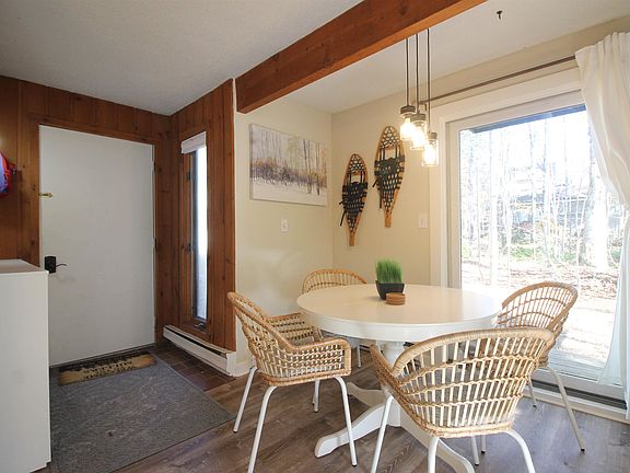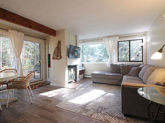 IDEAL LOCATION IN WATERVILLE VALLEY! This Snow's Brook garden level end-unit 2 bedroom condo is privately situated on the brook and has super easy access to Town Square and all of the network of trails! Enter the condo to find an open floorplan with the kitchen, living and dining area all connected. The condo has just been painted and many updates include vinyl plank flooring throughout the living area, kitchen and bedrooms... all-in-one washer/dryer combo, updated vanity in the full bathroom and more. Large windows in the living room allow the natural light to pour in the room. Just off the dining area is immediate outdoor access to the patio which then leads down to the brook. The primary bedroom suite is large with a king sized bed and 2 trundles under so sleeps 4 while bedroom 2 offers a twin over full with another trundle... sleeping 3 more. The couch is a pullout and offers more sleeping space...pile them in! Additional 1/2 bath is great for visiting guests and privacy. All of the furnishings are included so the property will be coming 100% turn-key. Owner is an active member of the White Mountain Athletic Club so the Buyer can pay the $750 transfer fee to transfer the membership. You'll absolutely love this location being so close to Town Square for coffee, restaurants and shopping while still having a private location and easy access to all of the network of trails. It's perfect!