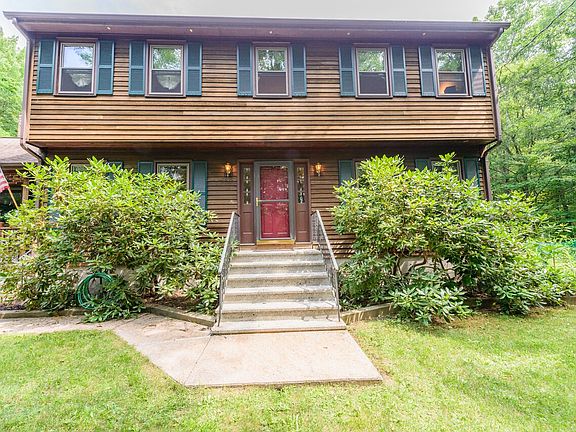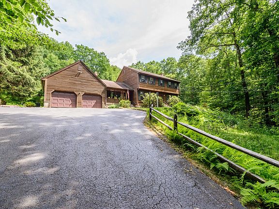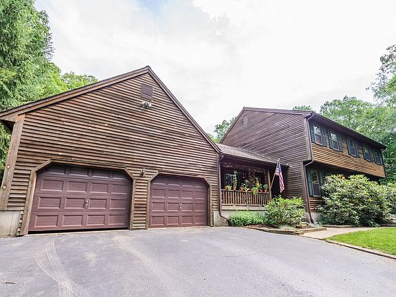 At the end of a long day, make this your retreat or make this your weekend destination. 4 bedroom colonial with mature landscaping. Detached 2 car garage with a large loft above can be used for many activities. There is also a convenient 2 car attached garage. Hardwood floors throughout this home with a custom kitchen and 2 full baths. Straight out the back door are 2 generous decks and private rear yard plus State Forest for acres of privacy and wildlife. This home has access to Wilson Pond for canoeing or kayaking.