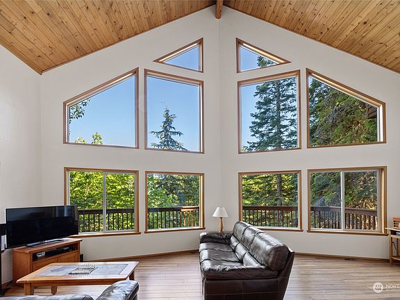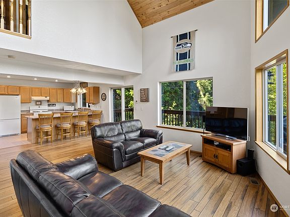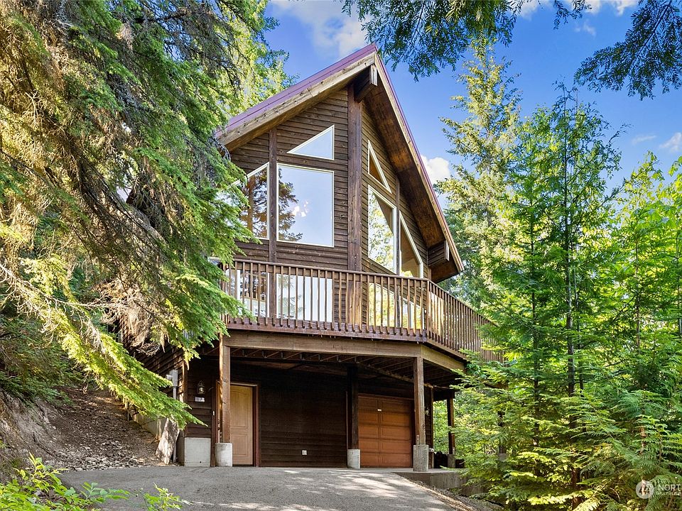 Picture perfect classic chalet at Lake Kachess! This beauty features 2 stories of soaring windows for amazing natural light. The main floor features gorgeous wood t&g ceilings, new bamboo floors, a free standing toasty wood stove, & a lovely kitchen with granite counters + eating bar. Also on main floor- a full bath, laundry w/pantry storage, & access to the wrap around front deck for sunshine & mountain views. Upstairs are 2 nice sized bedrooms with vaulted ceilings! Both have nice closets & share a full bath. The entry ground level has a tiled entry & access to the attached fully finished garage w/workbench + room for your snowmobile or jetski. New roof! Most furnishings included. Members have access to the clubhouse & private boatlaunch!