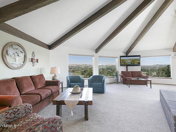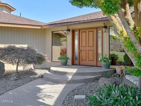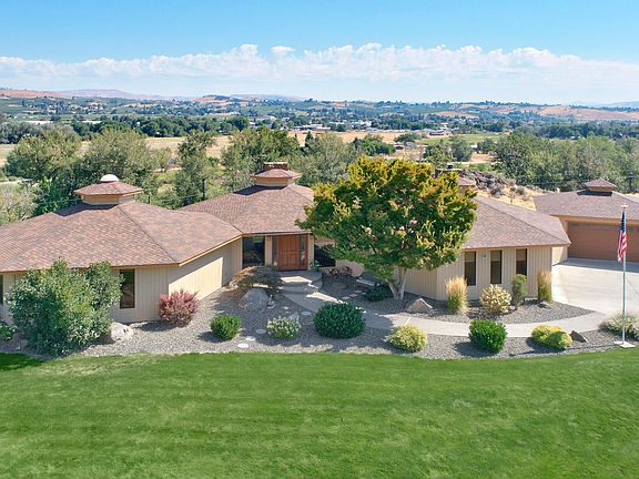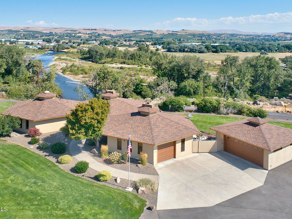 Rare Naches River views from this unique architecturally designed home. Large floor to ceiling windows in every room to take in the outdoors. The vaulted beamed ceilings over the living, dining and kitchen areas allow for an abundance of natural light and easy flow when entertaining in the space. Cozy family room with gas fireplace. A comfortable and inviting home with a numerous deck and patio spaces wrapping around the views. Updated kitchen with center island and new appliances. Primary suite faces the views, has private deck and updated bath with walk-in shower. Attached garage has adequate space to have home gym or yoga studio and second 2-detached garage/shop is a perfect space for all the extras. Under the house is large crawl space which houses additional lawn storage for mowers and other outdoor equipment. Outside you are surrounded by parklike grounds, beautiful mature plantings and special walking path around the property. Minutes from local wineries, shopping, hiking and all the Yakima Valley has to offer. This is a home to enjoy all the seasons and built to maximize the view in a stunning setting!