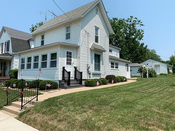Well-maintained 3 bedroom, 1.5 bathroom conveniently located in Sterling. The front enclosed porch offers a nice sitting area. The front door leads into the family room and what could make a nice dining room. The large, remodeled kitchen has a pantry and Kraft Maid cabinets. There is a main floor half bathroom and office or potential main floor laundry room. The second level features three bedrooms (master bedroom is a pass through to the 6x13 bedroom) and a full bathroom. The third bedroom has a walk-in closet. All bedrooms have beautiful laminate flooring. There is a second enclosed porch on the rear of the house which has a door to the unfinished basement. The beautifully landscaped yard has an 11x10 shed with electricity, and a two car detached garage with newer garage doors. Air conditioner (2017), City sidewalk (2019), Updated electric in the living room, garage, shed (2020). Call for your showing today!