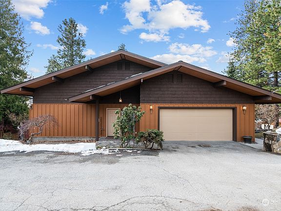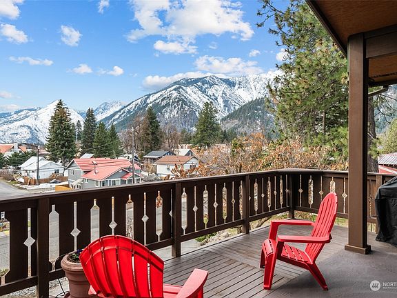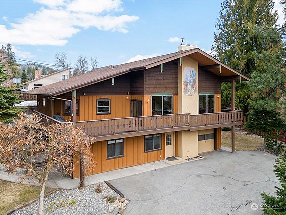 This stunning daylight rambler offers breathtaking views of Icicle Ridge, Wedge Mountain and downtown Leavenworth's colorful lights. Enormous windows flood the living room with natural light, creating a warm and inviting ambiance to come home to. Share unforgettable summer barbeques on the wrap-around deck, enjoying picturesque views and fresh mountain air. The main level garage and primary bedroom add to the home's convenience, while the rare 1/3 acre city lot boasts mature trees and a calming water feature, creating a serene oasis. Host visitors in the guest rooms downstairs or relax by the warmth of the cozy pellet stove. The basement shop, with its own exterior garage door, is perfect for hobbies. RV parking is an added bonus as well.