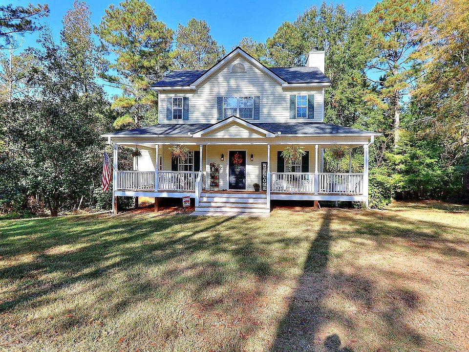 Two story over full basement (partially finished--just add vents to existing ductwork and flooring to cement floor) Rocking chair front porch with deck and patio New roof and HVAC Looks out over wooded back yard with fall, winter and spring view of Hard Labor Creek Reservoir. Backs up to land bordering reservoir; nothing can be built between this home and reservoir Large walk-in laundry/mudroom/pantry