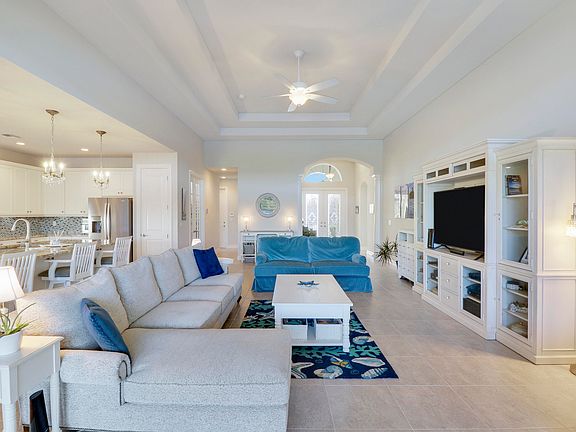 The interior of this 3 bedroom, 3 bath plus office/den home boasts many beautiful finishes. From the time you enter through the decorative double front doors you experience the 13 foot vaulted tray ceiling in the main room and 9 foot ceilings throughout. You will find a very well-appointed extended and open kitchen with an oversized island perfect for entertaining! Custom closets in the primary bedroom, as well as beautiful plantation shutters and blinds covering all hurricane impact windows. There is an oversized 2 car garage that is extra deep and fits 2 vehicles and a golf cart. SafeRack storage has been added in the garage to allow more room.