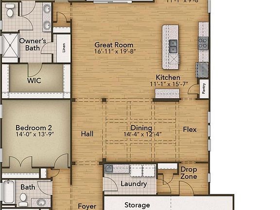 Upon entering from a large covered front porch, discover a foyer leading to a spacious drop zone area. Two bedrooms with large closets and a full bath are located on the left with an open dining area just ahead. A large island in the kitchen offers additional seating and a surplus of counter space for large dinner parties or cooking large meals. Enjoy smaller meals with an extended breakfast area looking out onto the beautiful view of the back yard. From the great room, breeze through sliding glass doors onto a large covered porch. This homes master suite offers an enormous walk-in closet accompanied by a beautiful master bath with a tile shower. Make this Sand Dollar floor plan your "home" today!