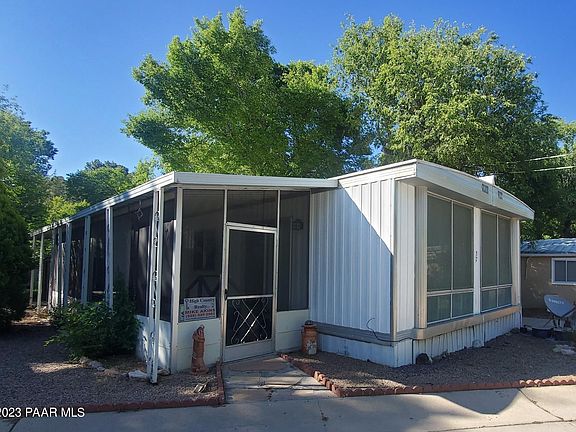 Fully furnished home for sale in the pines of Prescott, only minutes from downtown. Set in a quiet 55+ senior park that has mature trees and overlooks Aspen Creek, you can walk the creek to downtown. This 1140sf home is move-in ready with all new high-quality waterproof vinyl (wood-look) flooring throughout. This home has 2 bedrooms and the main bedroom has an ensuite and makeup area, along with TWO closets with cedar flooring. There are all new light fixtures throughout, new faucets, plumbing, vertical and horizontal blinds. Your laundry area is ready to use with a washer & gas dryer and the kitchen has a dishwasher and garbage disposal. Enjoy the large screened-in porch and covered car parking area. There is also plenty of room for storage with the shed on the property