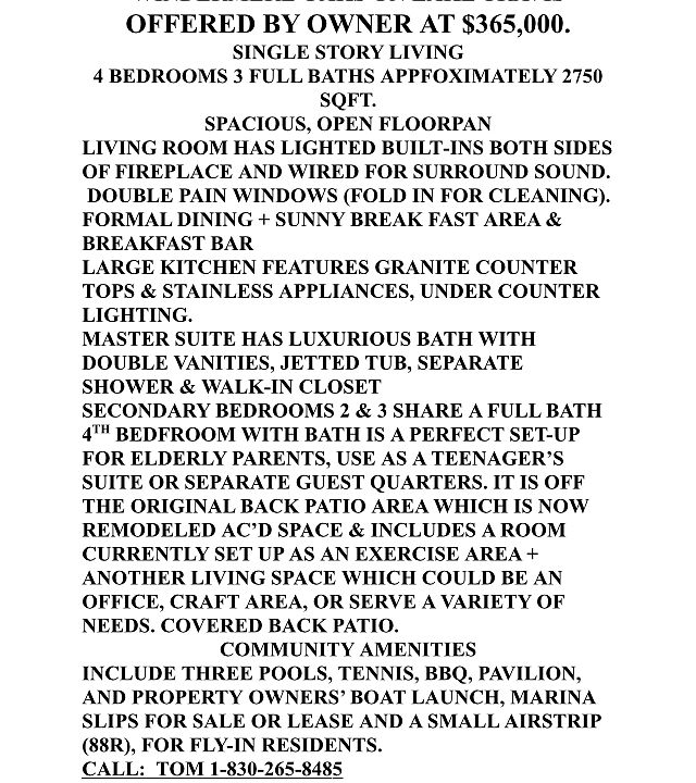 Spacious, move-in ready, this charming home is surrounded by beautiful oak trees and mother nature. Open floor plan with formal dining, kitchen with granite counters and stainless appliances and large family room. Two owner's suites, one with mini fridge and microwave and just off the 200Sq.Ft. bonus room with enclosed porch. Community amenities include swimming pools, tennis courts, community pavilion, boat launch and a nearby airstrip. Just steps from Lake Travis.