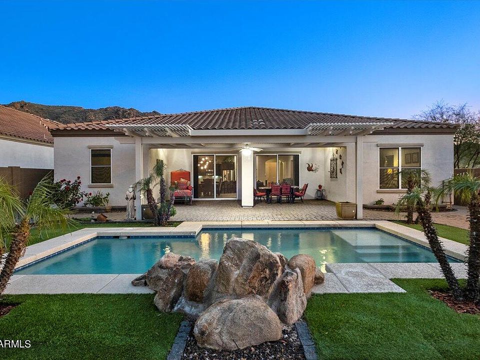 Situated on a premium corner lot at the base of the South Mountain Preserve, this single-level Sonoran retreat in Mineral Canyon offers straight-shot mountain views, pristine curb appeal with stone accents, plenty of upgrades, convenient access to hiking/biking trails & more! The desirable split floor plan is enhanced with an office/den upon entry, a private in-law suite & secluded luxury primary suite with separate dual vanities, soaking tub, walk-in tile shower & private toilet room. Gourmet kitchen is equipped with granite countertops + backsplash, crown molded espresso cabinets, under cabinet lighting, reverse osmosis & walk-in pantry. Enjoy resort-style living with a pergola-style covered paver patio, entertainer's outdoor BBQ kitchen, low maintenance artificial turf, sparkling -- Baja step pool & fire pit. Don't miss the upgraded hot water heater, pool pump (2022), water softener, recently painted exterior & 2-car epoxied garage with overhead storage, cabinets & keypad entry. This gem won't last long!