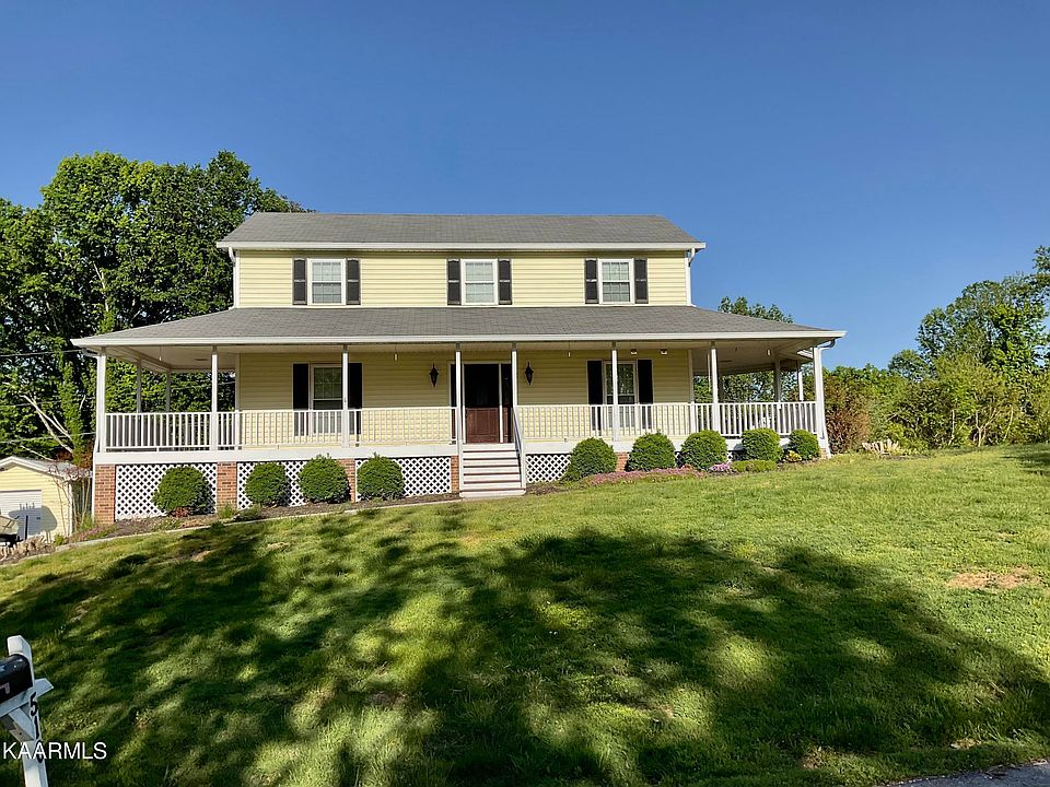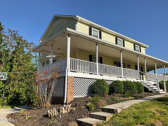 Great mountain top home with wrap around porch to absorb the views! Centrally located just outside of Jacksboro. Beautiful hardwood floors thru most of the house including staircase and upper hallway. Tile floors in updated Kitchen w/stainless appliances, granite countertops and tile backsplash. Breakfast bar also opens to formal dining area. Access from both to the pergola style side porch that joins the extensive front porch. Owner's suite includes two closets, w/one being walk in, vanity area w/granite top, & separate area w/toilet, tub/shower & linen closet. Split BR's from owners suite, large hall bathroom & nook at top of stair landing complete the upper level. In addition, there is a finished room in the lower level that can easily be a rec room or bedroom. Seller has flooring to match & will leave if buyer wants to finish the staircase down. Spacious garage with loads of storage or workshop area. Easy to show! Showings start Friday, April 28,2023,so call today to schedule for then. Property IS eligible for USDA RURAL DEVELOPMENT 0% down payment loan program!!