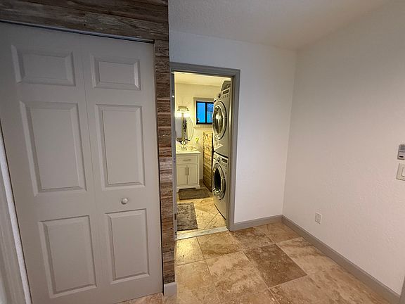 The unit includes a washer and dryer and comes furnished (except for the living room couch). Power and utilities are included in the price but not the internet
