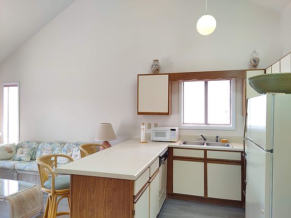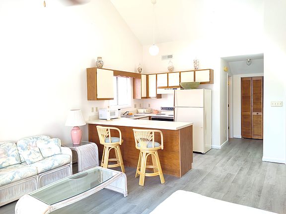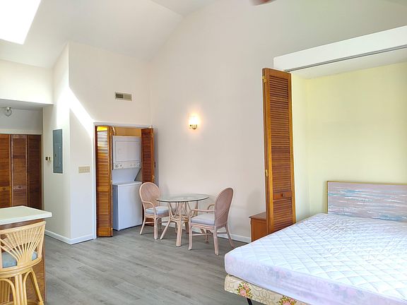 Third-floor large studio apartment in Island Green for long-term rental by one occupant only. Luxury vinyl plank flooring throughout. Cathedral ceiling with skylight, two closets. Full bath, full kitchen, and central A/C. Washer/dryer included. Large private balcony with a peaceful view. Furnished with queen bed, dining table with chairs, and stools. Long-term lease with $1000 monthly, plus security deposit (same amount as monthly rent). Rent includes water/sewer, trash removal, Spectrum cable and internet, and the use of the community pool. The tenant pays for electricity. Available now. No application fee. NOT a seasonal rental. STRICTLY NON-SMOKING AND NO PETS. Please email your contact information, monthly income and confirm that you will be the only occupant living in this unit, you don't ever smoke anywhere, have no pets, and have the first month's rent and the security deposit ready to rent this unit immediately.