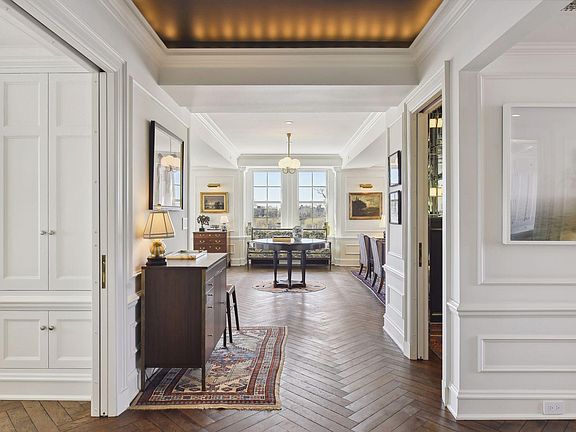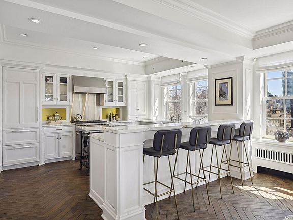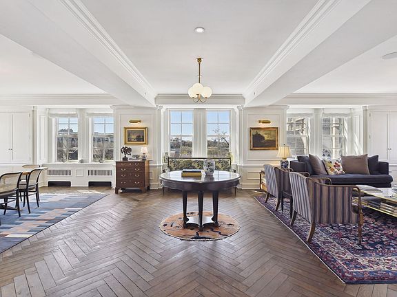 home by its vast windows on 3 sides. Buyers will marvel at the refined renovation which features best in class finishes, fixtures and appliances. A highly desirable floor plan melds the kitchen, dining room & stunning living room adorned w/a wood burning fireplace. Extensive bookshelves & cabinetry in the library/office makes for a glorious place from which to work. Hand painted Zuber wallpaper creates a stunning family room which can double as a 2nd bedroom. The owners suite is everything one can hope for; large bedroom w/sitting area & fireplace, owners bath w/lavish marble walls, floor, as well as counter tops & tub. The infrastructure of this unit is as impressive as the finishes w/private water heater, purifier & softener plus private AC & Sonos.